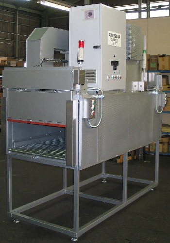 - 特長:インラインで作業が出来るよう、ラインと同高のローラーコンベアを炉内に装備している。前後部にはギャモーター駆動の昇降扉が取り付けてある。ワークの入出庫は手動で行なう。硬化に60分かかるので、作業上は問題ない